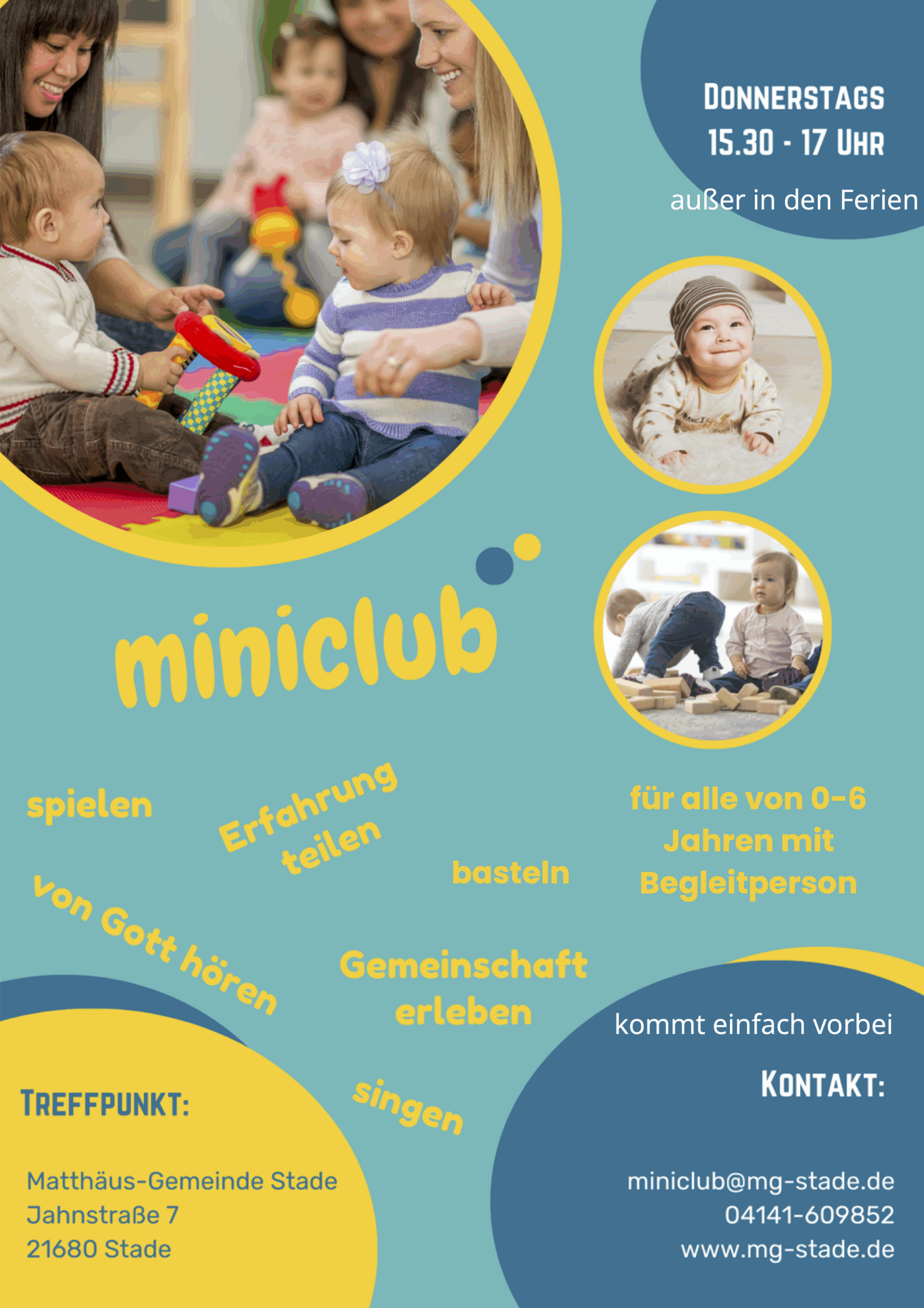 Der Miniclub ist unsere Spiel- und Krabbelgruppe für alle Kinder von 0 bis 3 Jahren mit ihren Eltern, Großeltern, Tageseltern… Im Miniclub wird gespielt, gesungen, getobt und gelacht. Nach einem gemeinsamen, kurzen Programm – mit Liedern, Fingerspiel und biblischer Geschichte – das ganz auf unsere Kleinen zugeschnitten ist, bleibt noch Zeit um miteinander zu quatschen und eine Tasse Kaffee oder Tee zu genießen.